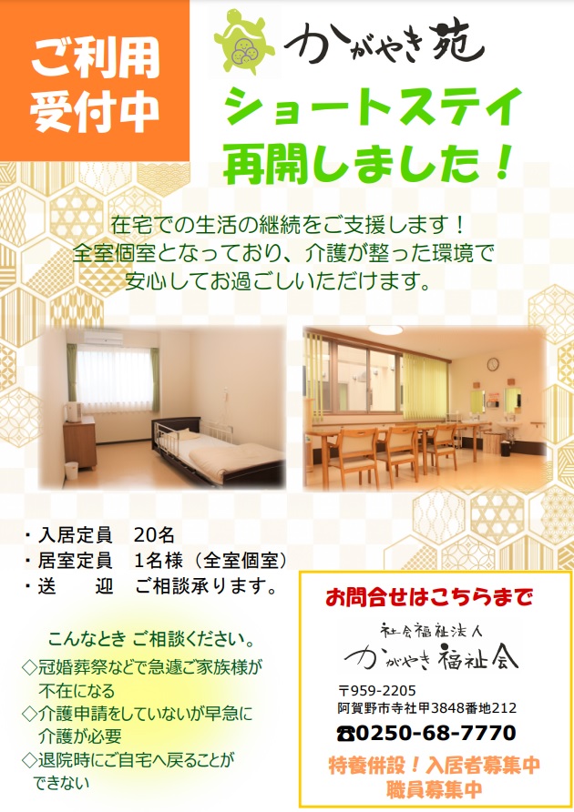 長らく休止していたショートステイを令和3年4月1日より再開致します!!!