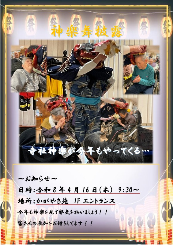 昨年もお越しいただいた地域の神楽の皆さまが、今年も当施設に来てくださることになりました。